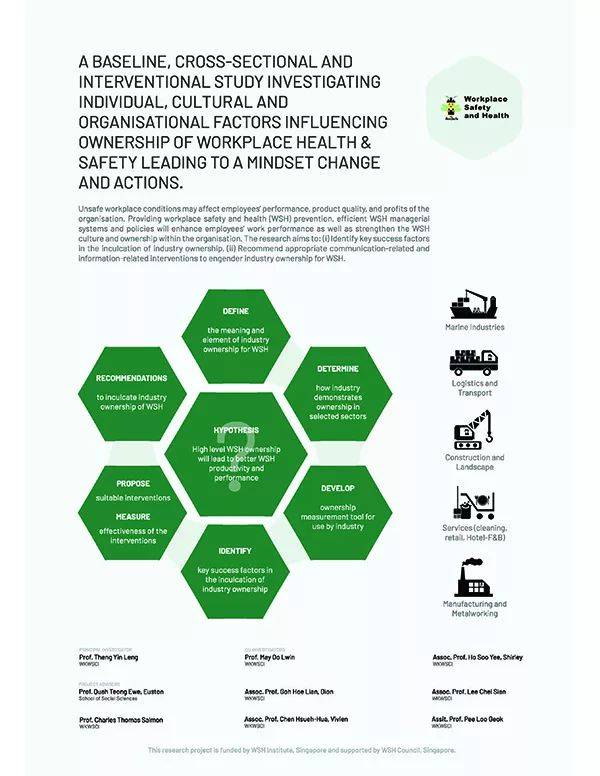 以工作者爲對象去介入調查工作場所安全和健康。國家一直很重視Workplace safty and health,工作場所安全與健康,簡稱WSH。不安全的職場環境會影響職員的表現、産品質量和組織利潤。通過對産業所有權和公共關系學的研究,致力于有效的WSH管理系統和政策,提高員工績效,並加強組織內部WSH文化和所有權。