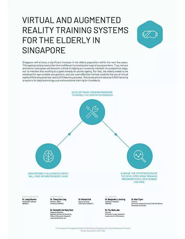 以老齡人口爲對象去研究的虛擬與現實增強訓練系統。根據官方數據,在接下來的幾年,新加坡的老齡人口數量將會激增,意味著年輕勞動力的短缺更加嚴重。因此,年長和資深的員工成爲保持經濟競爭優勢的關鍵。爲此,需要爲長者進行適合其年齡的職業培訓,使用虛擬現實(VR)和增強現實(AR)是一種有效的方法。