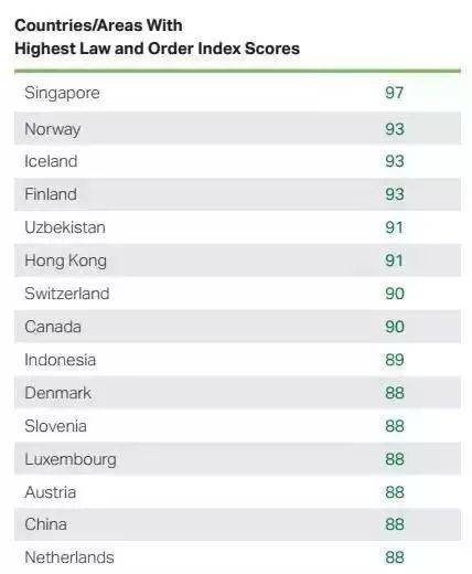 2018年美國民意調查公司蓋洛普公布了最新的《全球法律與秩序報告》(2018 Global Law and Order report)。該報告根據全球142個國家和地區的居民反饋,基于居民自身的安全感,對全球各地的地點進行了排名,得分越高,說明安全系數越高。新加坡以97分排名第一,然後是挪威、冰島、 芬蘭以93分並列第二至四位。這一點可以說是全球許多移民人士選擇移居新加坡的一個主要原因。