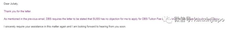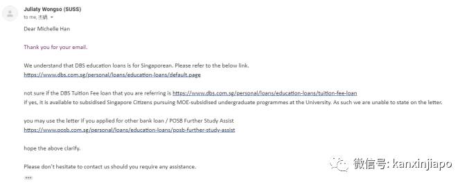 當下銀行給我的建議是讓學校出一個Acceptance Letter證明學校允許我去申請DBS Tuition Fee Loan就可以上訴。我就去問學校拿,但是學校的回複是說不能把這一點寫進信裏面,因爲他們一直以來就只是讓新加坡人申請,就算銀行批准了我的申請也不能連接上。