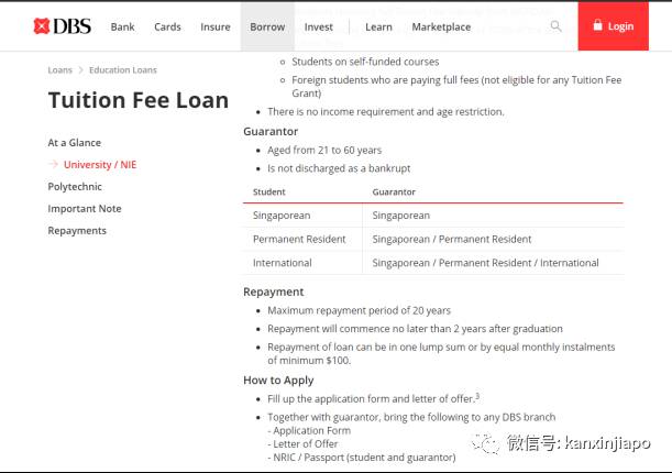 因爲我感覺不能一下子拿出來那麽多錢去交學費,就查到DBS有一個貸款叫DBS Tuition Fee Loan還蠻適合的,而且新加坡人或者PR都可以去申請。我還打過幾次電話去DBS問清楚的確是新加坡人或者PR都可以申請的,申請方法就是要帶著學校給的申請表和個人資料去到分行辦。