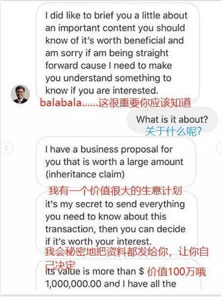 “我今天就收到一個自稱是馬來西亞銀行家的信息,拿100萬的項目做誘餌”
