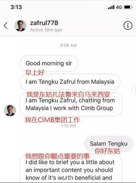 一位自稱來自馬來西亞,在CIMB工作名字叫東姑紮魯法的人,在INS私信安甯次長,號稱自己有個投資項目。