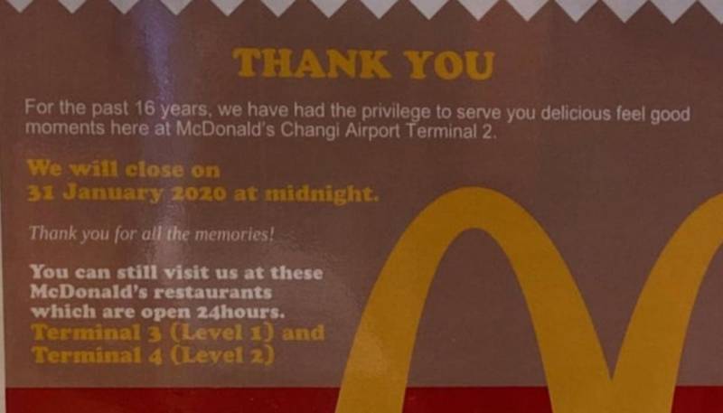 樟宜機場T2麥當勞關門
