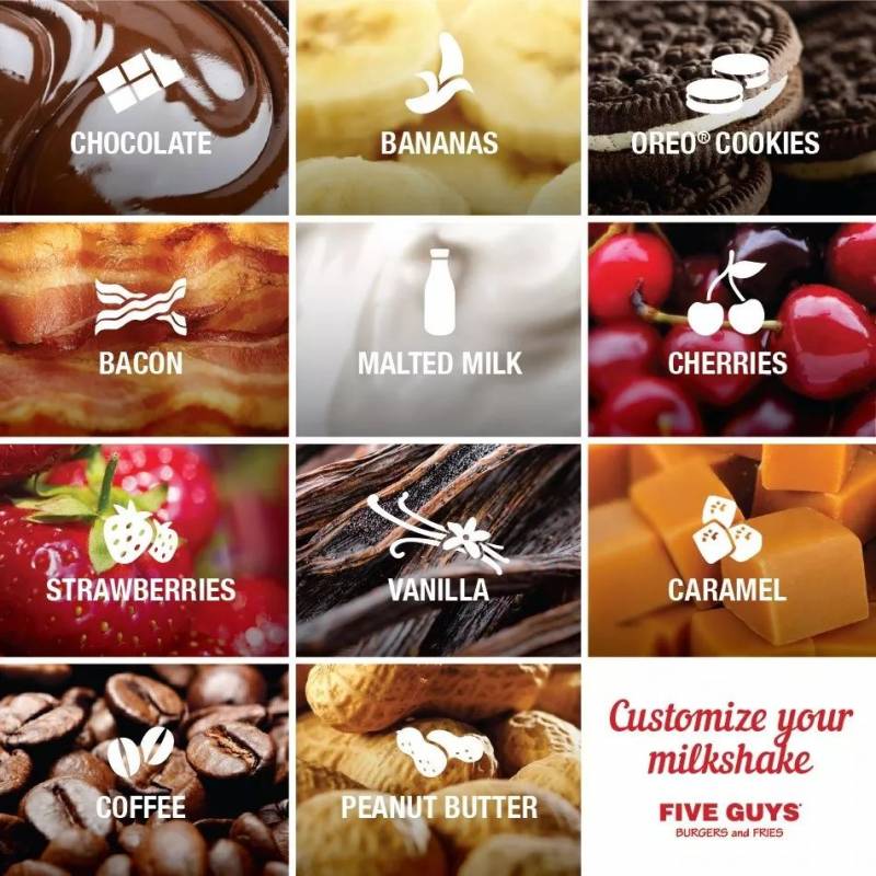 Five Guys另一個必須打卡的就是奶昔啦。像漢堡一樣,奶昔也提供很多可定制的口味選擇,巧克力,香蕉,草莓,香草等等。這裏有一種特殊的口味,那就是培根!雖然聽起來很黑暗料理,但是喝起來口感還不錯。
