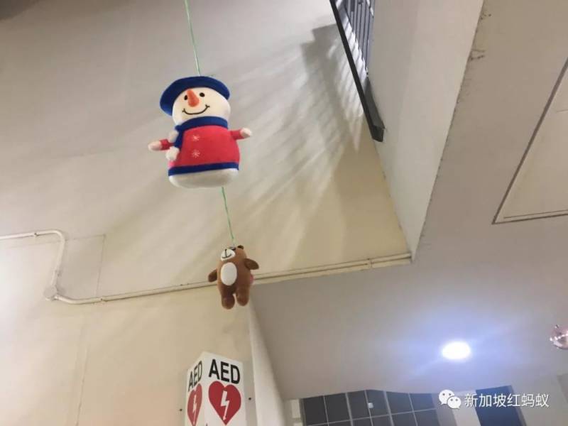 這位熱心居民串起了一條線,將各種可愛的娃娃懸空挂起。經過這個地方,擡頭一看,就會看著在“飛翔”的娃娃,好像是一個個慶祝聖誕節到來的小精靈一樣。