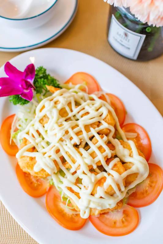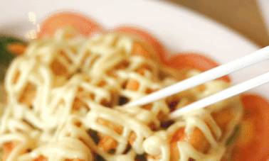 蝦球上的醬是芥末醬與奶黃醬的混合