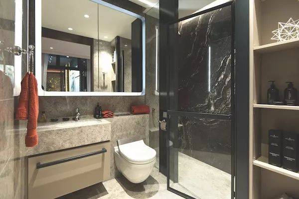 主衛生間的特色牆是用紋理對稱的大理石砌成的。(圖片:Albert Chua/EdgeProp Singapore)