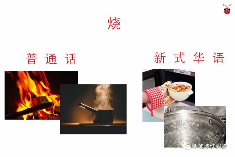 有時也會聽到新加坡人說,我去弄燒食物,其實說的就是去微波爐將飯盒加熱。“燒水”也是常聽到的,有時指煮水,有時指熱水,因此點飲料時也會聽到攤主問你:冷的還是燒的?