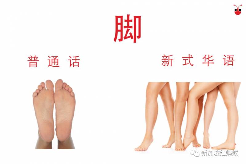 腳是腳,腿還是腳。 這是紅螞蟻初到新加坡念書時覺得最詭異的說法。沒想到新加坡人的“腳”大到舉凡大腿以下的部位都可以統稱爲腳。不管聽很多遍還是覺得超詭異。