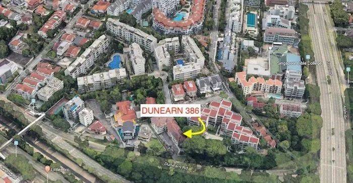 Dunearn 386的地段之前是屬于杜尼安閣(Dunearn Court),是一個擁有12個單位的小型公寓項目。Dunearn 386的地段是由新加坡發展商樂斯太平洋控股(Roxy-Pacific Holdings)旗下的子公司RH Central 在2017年集體出售時成功收購。