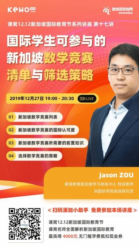 爲了能夠讓大家了解新加坡的各類奧數競賽以及相關細節問題我們特意邀請到了課窩的新加坡特級教師 Jason ZOU爲大家詳細介紹相關問題。