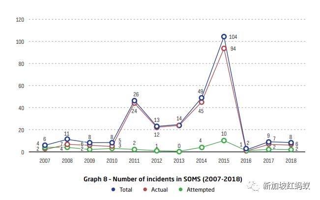 去年新加坡和馬六甲海峽總共只有8起海盜事故,今年情況急轉直下。(ReCAAP報告截圖)