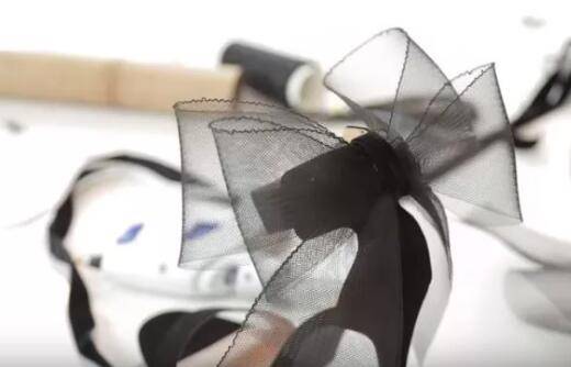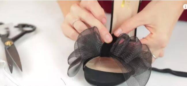 後面的大蝴蝶結會稍微麻煩一點。她先用網帶折出半個蝴蝶結,用針線固定住,再折出另一半的蝴蝶結。同樣的方法固定好。