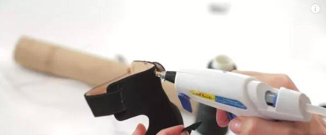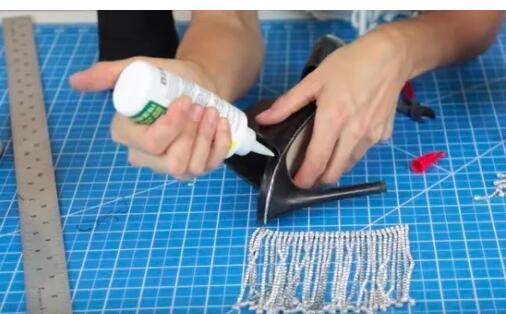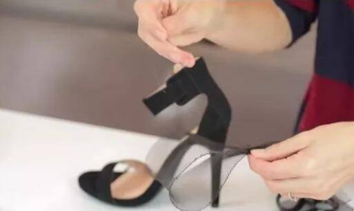 用兩角釘和錐子固定在高跟鞋上,在有兩角釘的地方貼上腳跟保護貼。