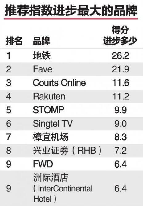 國際民調機構YouGov日前展開調查,了解新加坡人對衆多品牌的滿意度,再把成績分爲推薦指數得分最高,以及分數進步最大這兩個排行榜。