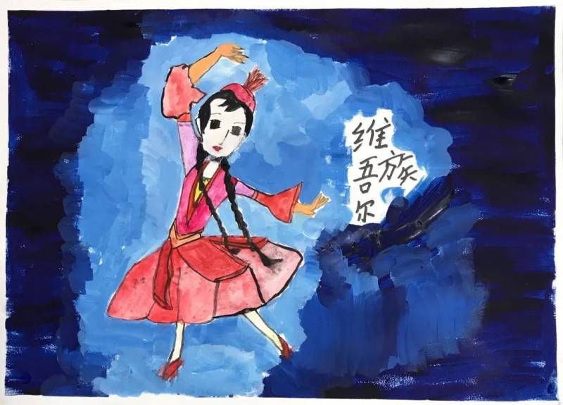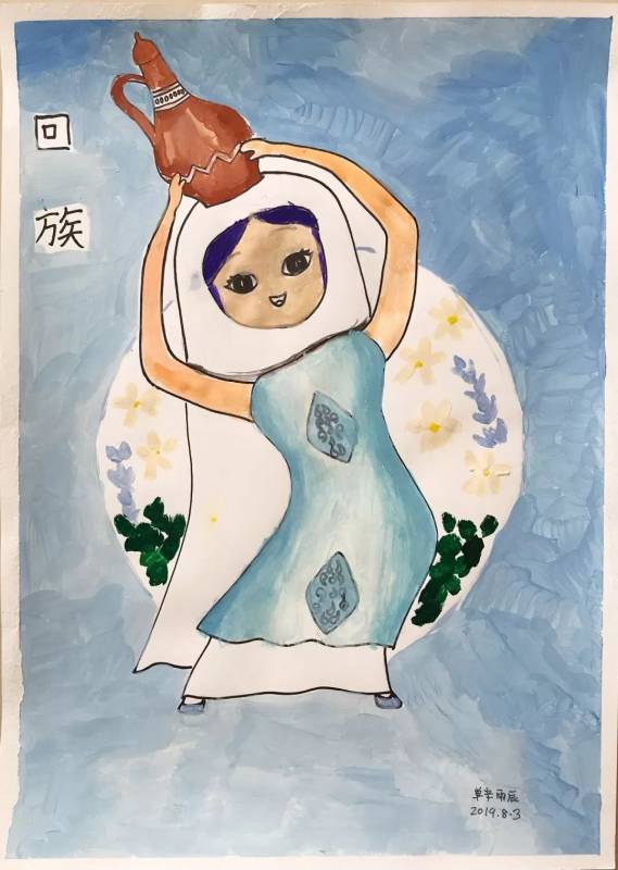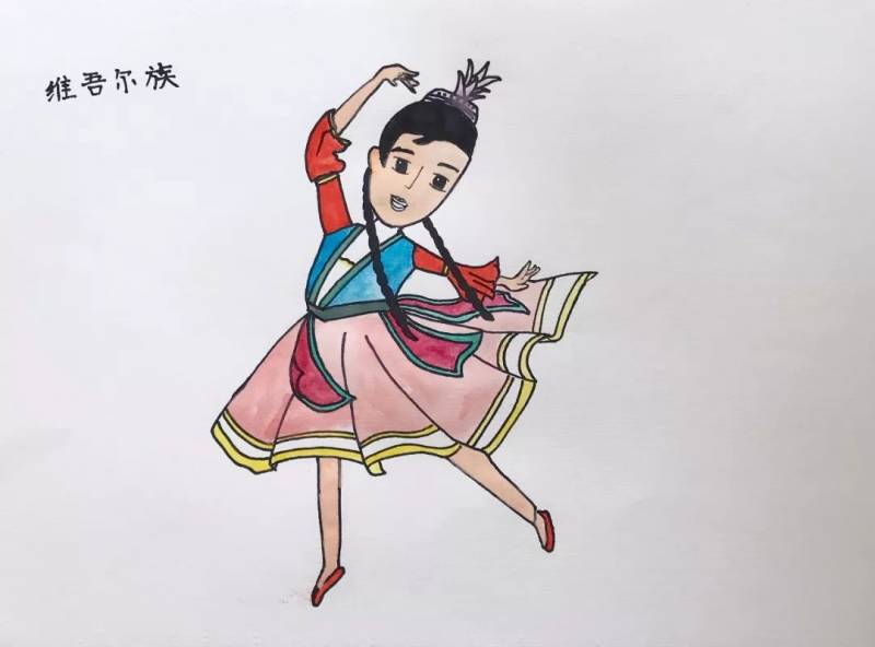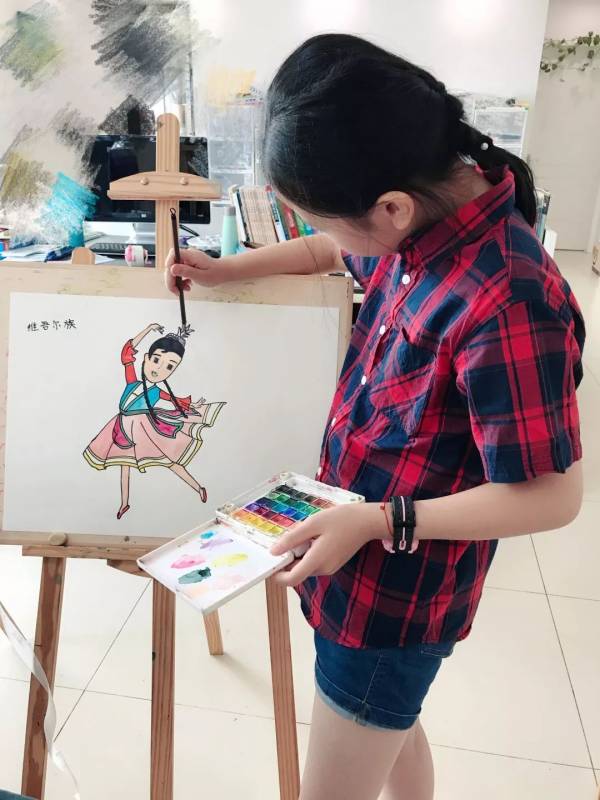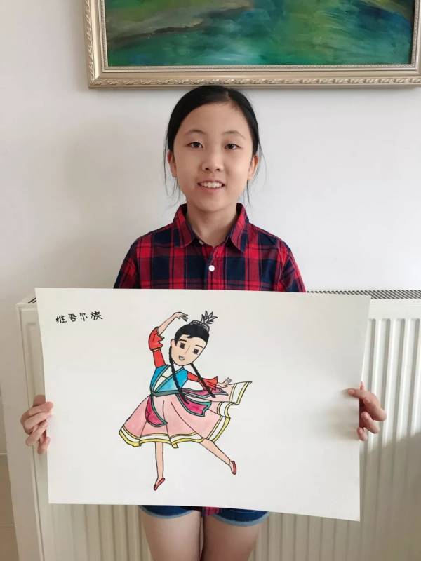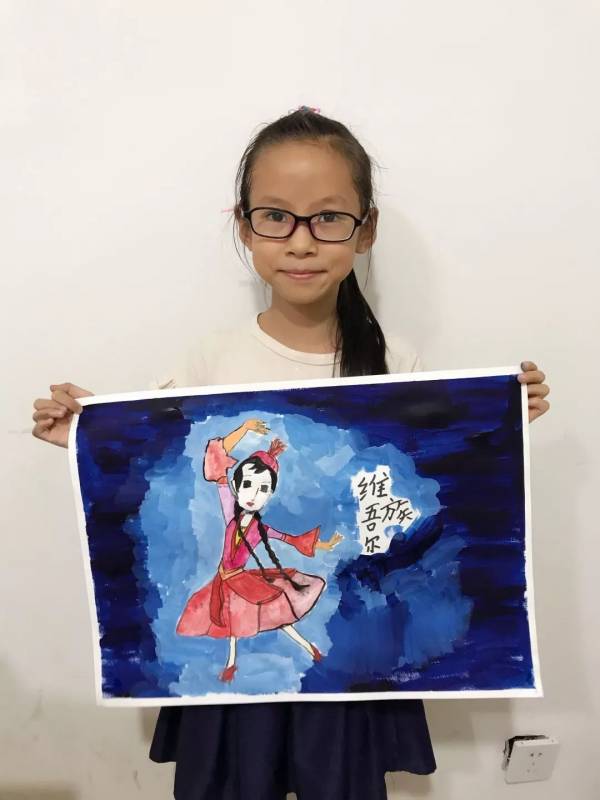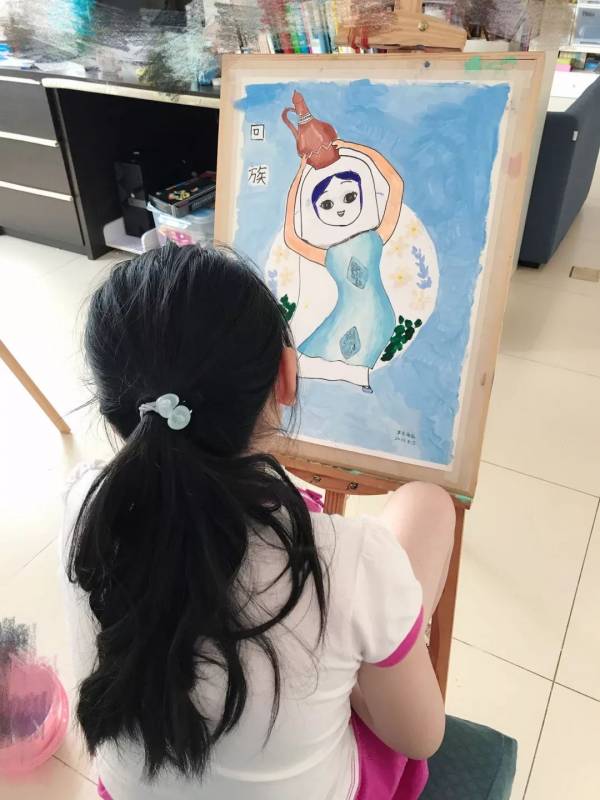 接下來的手繪課我們選擇自己喜愛的民族圖案,設計民族風情插畫,穿戴民族服飾的維吾爾族、回族、苗族、傣族小姑娘躍然紙上。