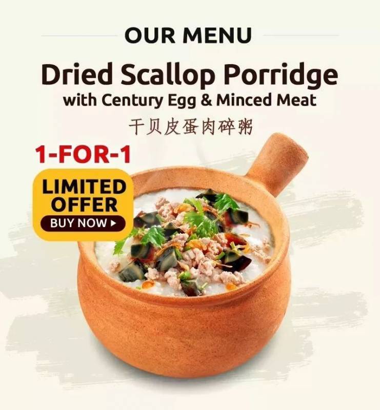 Claypot Porridge最近也推出了買一送一優惠:軟糯香甜的白米,配上豐盛的幹貝、皮蛋和肉碎,美味營養的幹貝皮蛋肉碎粥買一送一啦!活動截止時間爲1月10日,需要先在Qoo10上購買優惠券,就可以在任意一家A-One Claypot House或者A-One Signature outlets享受優惠啦!