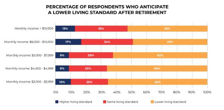 即使在每月收入超過10,000新元的受訪者中,也有大約一半的人表示,他們預計退休後的生活水平會降低。