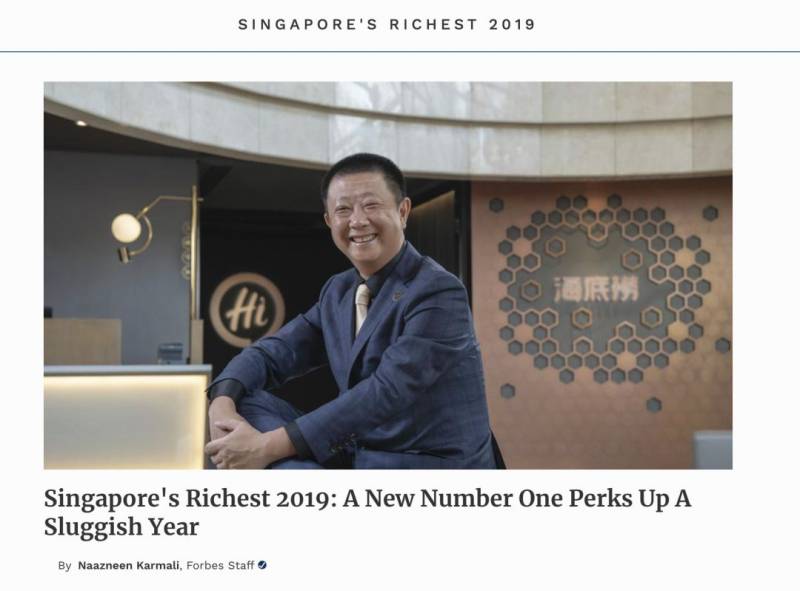2019年8月, 大家應該都看過這個消息, 根據《福布斯亞洲》新加坡50大富豪榜單, 海底撈老板成了新加坡首富了~