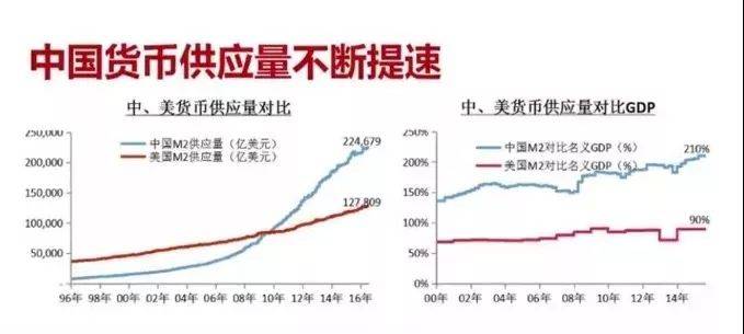 貨幣供應量不斷增速,過去20年裏,中國的貨幣供應量增速爲19%,美國僅爲7%。貨幣超發帶來的連鎖反應就是貨幣貶值,通脹加大。過去100年美國通脹年複合增長率達到3.3%,從1913年開始到2015年美元購買力貶值了97%,每年貶值3.3%;人民幣完成這一壯舉只用了30年,期間人民幣的購買力貶值了91%,每年貶值9.3%。也就是有100萬的人民幣,9.3萬就沒了。