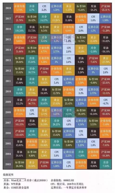 但是由于持單一貨幣資産這件事風險又很大,所以許多人更願意進行全球資産配置。下面是2018年全球大類資産曆年收益圖。