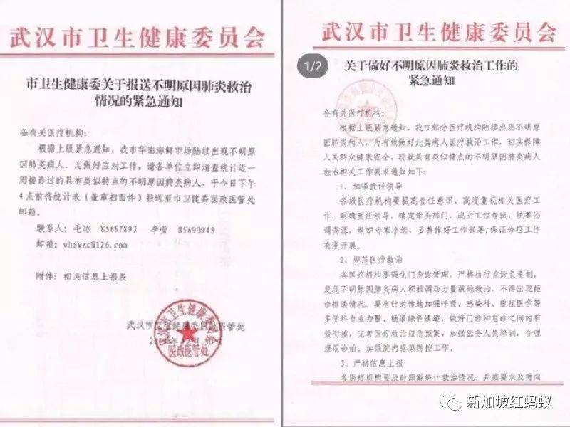 這兩份文件來自武漢市衛健委發布的《關于報送不明原因肺炎救治情況的緊急通知》,特別提醒武漢全市醫療衛生機構清查統計近一周接診的疑似不明原因肺炎病人。 武漢市疾控中心當天也證實,網上流傳的兩份文件真實,但強調沒有網上所傳那麽嚴重,針對不明原因肺炎有成熟的處置流程,中國國家衛健委專家組也立即抵達武漢。 武漢市衛健委2019年12月31日隔天趕緊再發通報辟謠說,近期部分醫療機構發現、接診多例與當地華南海鮮批發市場有關聯的肺炎病例。經專家會診系病毒性肺炎,截至31日,調查未發現明顯人傳人現象,未發現醫務人員感染。目前對病原的檢測及感染原因的調查正在進行中。 據通報,武漢市全市目前發現27例病例,當中有七例病情危重,其余病情可控,有兩例病情好轉,擬近期出院。 病例的臨床表現主要爲發熱,少數病人呼吸困難,胸片呈雙肺浸潤性病竈。所有病例均已隔離治療,密切接觸者的追蹤調查和醫學觀察正在進行中。 此外,對華南海鮮城的衛生學調查、和環境衛生處置也在進行中。 華南海鮮市場元旦起也休市整治,直至另行通知,目前只有檢疫人員能夠進出。 該市場距離最近的民居大約有600多米,但封鎖範圍暫時未有擴大。
