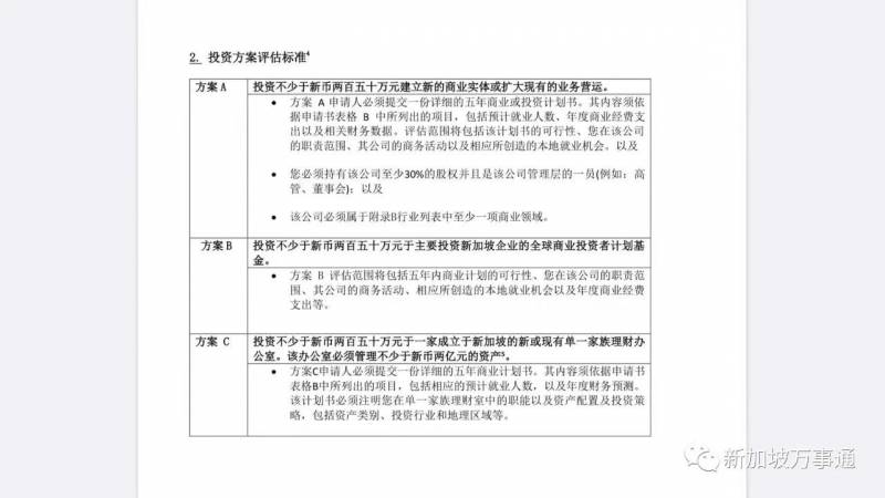 2億是門檻,除此之外,想投資移民必須在新加坡投資至少250萬新元建立新的商業實體,或者擴充現有的商業運營,或者投資至少250萬新元予一支全球商業投資者計劃基金。