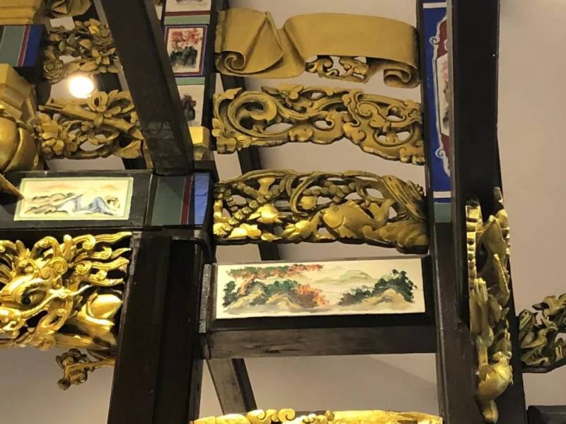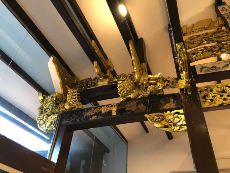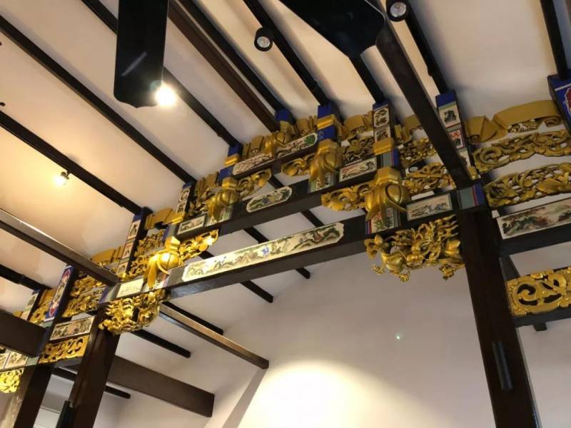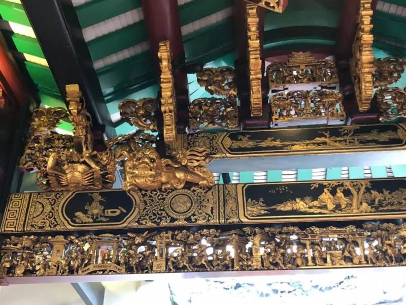 此外,梁架上本還有擂金畫,即黃金漆畫。“擂”同“擂茶”之“擂”字,表研磨之意。擂金畫,即研磨金箔成粉作畫,是閩南地區的傳統手工藝。 然而現在應和會館能夠看到的這些黃金漆畫,已經不是當年保留下來的畫作了。據說會館在修複時,因擔心上面的金箔粉被人扣掉,于是直接用金漆塗料進行描補,這著實是有些可惜了。