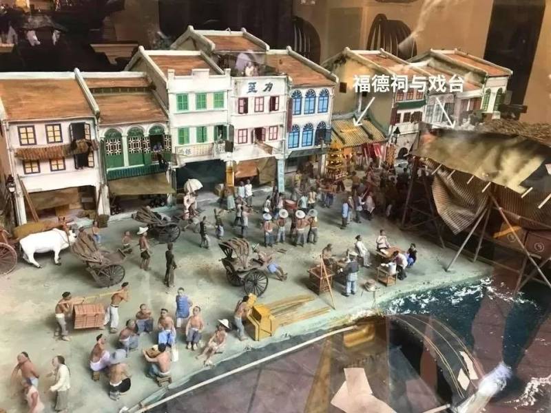 街景模型中央那棟不高的建築就是古老的海唇福德祠,正對著福德祠的海灘上用木頭支起一個戲棚,戲台正對著廟中的神明,因此在此演戲是爲答謝神明,這也與大多寺廟中的戲台一樣。