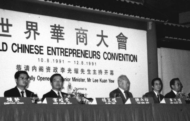 早在1987年總商會會長陳永裕訪問中國時,就曾向中華全國工商業聯合會表達了舉辦世界華商大會的構思和設想。1991年8月10日,在李光耀的支持和鼓勵下,由新加坡中華總商會主辦的首屆世界華商大會在新加坡順利召開。
