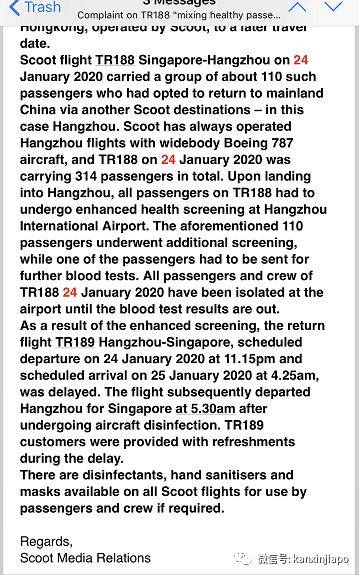 2. 一般說“謠言止于智者“。在過去或許如此,但是,在信息爆發的今天,更關鍵的恐怕是“謠言止于冷靜者“。冷靜觀察,冷靜判斷,不要急著轉發,更不要急著揣測或聯想。3. TR188事件訛傳,始于“被遣返““被打包“。倘若“被遣返“是事實,那麽說明遣返方掌握這群旅客不宜入境的情況;倘若“被打包“是事實,說明遣返方不顧其他旅客的健康,率意行事。正因這樣的考慮,才引起這個訛傳的超高大衆關注。4. 那麽,酷航允許這110名旅客改簽到TR188,是否有問題?應該說,酷航沒有拒絕這些旅客改簽的合情合法理由。5. 機上有旅客發熱,酷航爲何允許登機?我們都知道,新型冠狀病毒肺炎潛伏期長,初期病症不顯。旅客安檢體檢時沒問題,在飛機上坐了幾小時後發病,並非不可能。6. 新加坡是否當時就不該准許這批旅客入境?武漢宣布封城是1月23日淩晨的事,這批旅客是24日下午登機,按常理說,他們應該是在武漢封城之前抵達的新加坡。作爲外國政府,新加坡不可能比武漢有先見之明。7. 酷航是否該向同機其他旅客說明機上有110名武漢旅客?見仁見智。8. 很快是春節出國旅遊人群的返程高峰。這些人肯定不少是從武漢出發的,現在武漢封城,他們只能改期或改簽。改期不容易,因爲不可能在國外長期逗留,改簽更有可能。因此,接下來我們還會見到更多武漢出發的旅客飛其他城市。這個會成爲近期的一個常態。同樣成爲常態的,很可能是各個落地機場的加強版的各種體檢和暫時隔離措施。9. 現在怎麽辦?從病毒的潛伏期和擴散程度判斷,盡管武漢是始發地,現在任何人都有攜帶病毒的可能性。因此,能少接觸人群就少接觸人群,盡可能自我隔離。如果非得接觸人群不可,自備口罩、消毒液等設備,勤洗手,多通風。僅僅“坐我身邊的這個是不是武漢人“,已經無法判斷“安全性“了。因此,一視同仁,一致多謹慎,少接觸。
