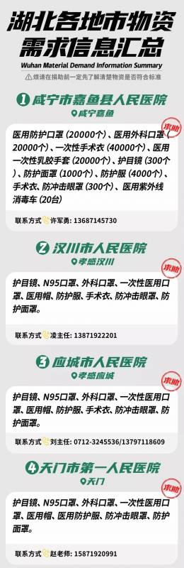 國內物資捐贈,請聯系武漢紅十字會。 24小時值班電話:027-82788599,027-82210181,027-82812604,027-82858499,027-82856122。 如有特殊需要咨詢的事情可以聯系駱鋼強13297963117。