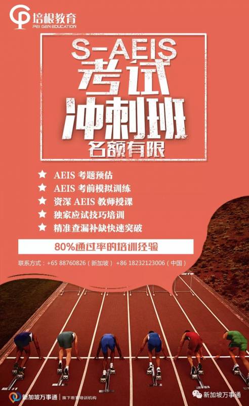 雖然一些中國學生不能來新加坡,畢竟目前還是有很多在新加坡讀AEIS預科備考,以及在國際學校、私立學校讀書,准備參加2月份的考試的學生,本身就非常之多。他們在這裏學習,一心准備AEIS/S-AEIS考試,很多學生就是爲了進政府學校。2月份的S-AEIS考試會如期舉行,暫時沒有任何政策調整。 萬事通老師提醒,AEIS/S-AEIS考試是外籍學生進入新加坡政府中小學的唯一通道。這個考試門檻對于英文非母語學生來說確實是存在難度的,教育部也會根據學校的名額情況,擇優錄取。 新加坡備考的學生,抓緊時間做最後的沖刺!國內的學生,做好最壞的打算,如果這次不能來考S-AEIS考試,一定要爲9月份的考試做足准備。