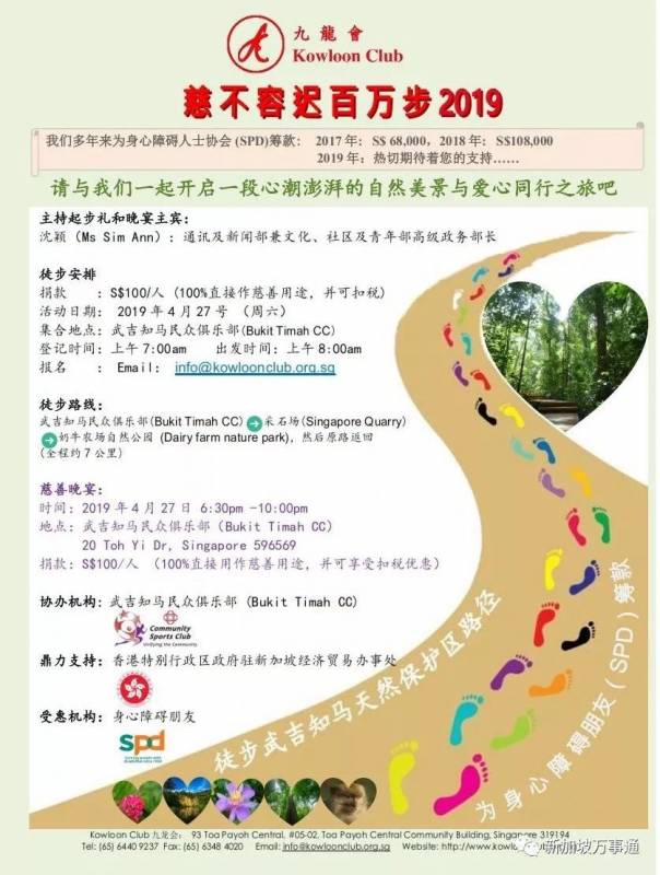 大愛無疆永前行 其實,九龍會作爲新移民組織,一直活躍在慈善的第一線。 2019年4月27日,爲了幫助新加坡的體障人士協會籌款,九龍會的“慈不容遲百萬步”徒步籌款活動圓滿成功。