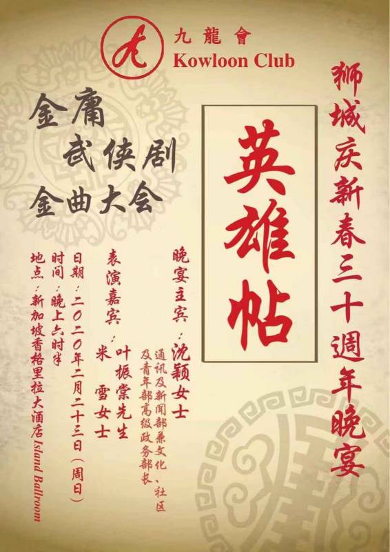 武林大會時間:2020年2月23日晚上6時半 武林大會地點:新加坡香格裏拉大酒店 少林桌:$5000 武當桌:$2500 峨眉桌:$1250 如非團體預訂,個人位置的價位是$125,不管是“團戰”還是“一人應戰”,這份英雄帖都期待你的莅臨。請大家預留好時間,九龍會和大家不見不散哦~ 如果你想報名,按照以下報名方式聯系九龍會: 地址:Kowloon Club 93 Toa Payoh Central #05-02 Toa Payoh Central Community Club Building Singapore 319194 電話:(65) 6440-9237 Fax: (65) 6348-4020 郵箱: [email protected]