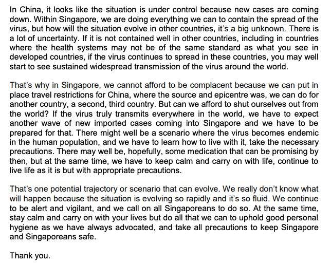 衛生部部長顔金勇表示:鑒于目前疫情發展的不確定性,一旦疫情在全世界普遍傳播,政府有可能會降低警戒級別,因爲新加坡不可能和其他國家隔開。
