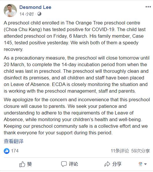 新加坡社會及家庭發展部長李智陞也在Facebook貼文證實了這則消息。據他透露,男童自從上周五之後就沒有再到過幼兒園,幼兒園爲了以防萬一,將從明天關閉至本月20日,直到上周五之後的14天潛伏期結束。李智陞指出幼兒園將會進行徹底清潔和消毒,所有職員和孩童也必須請14天缺席假。幼兒培育署正在密切觀察情況,並將跟幼兒園管理層、職員與家長合作。