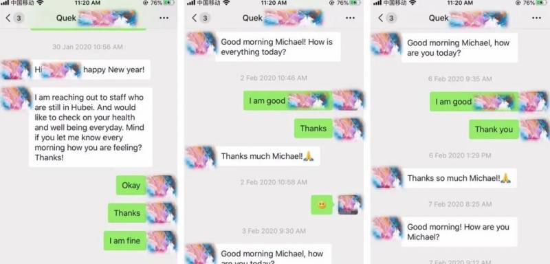 此後,從1/30開始,公司還特別爲Michael建了一個專用微信(新加坡一般使用WhatsApp,但中國國內因爲防火牆的關系而無法使用),由專人負責與Michael保持日常溝通,以確認Michael的身體和生活狀況。這一“daily greeting”至今已經風雨無阻地持續了45天,哪怕是休息天也不例外,並且在Michael回到新加坡之前還將繼續持續。