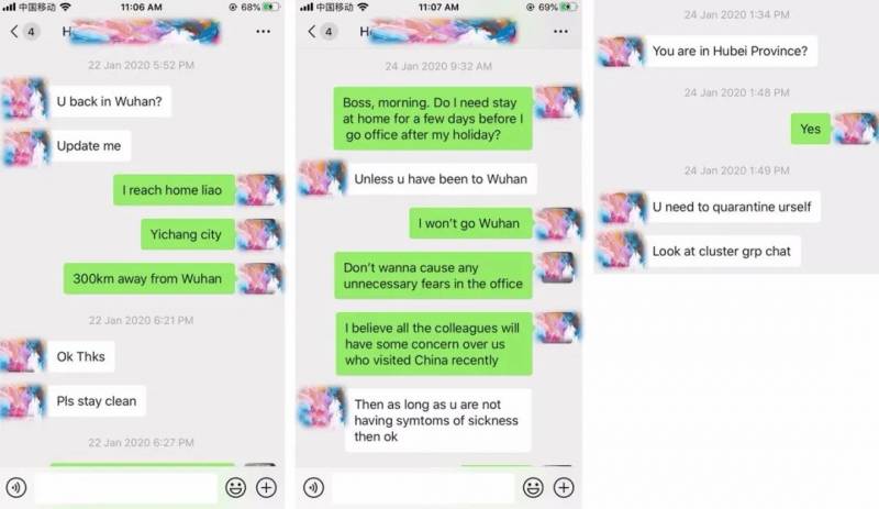 說到公司同事,其實Michael的老板因爲知道他回國了,所以在Michael抵達宜昌的當天即發來信息,詢問他是否安全,並要求他自我隔離,同時“stay clean”。