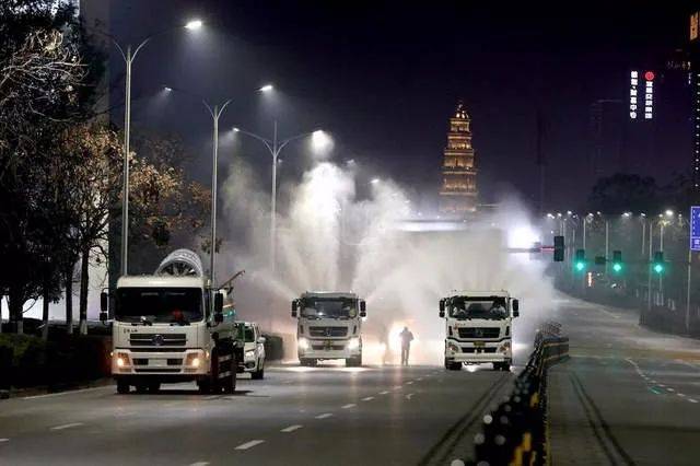 (入夜,成隊的消毒車勾勒出一道奇異的風景)