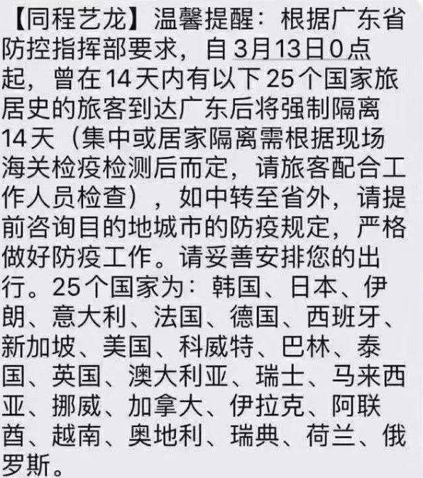 凡是從韓國、意大利、伊朗、日本等疫情嚴重國家經廣東口岸入境的,或經其他國家或地區從廣東口岸入境且過去14天有韓國、意大利、伊朗、日本等疫情嚴重國家旅行史、居住史的旅客一律隔離14天。