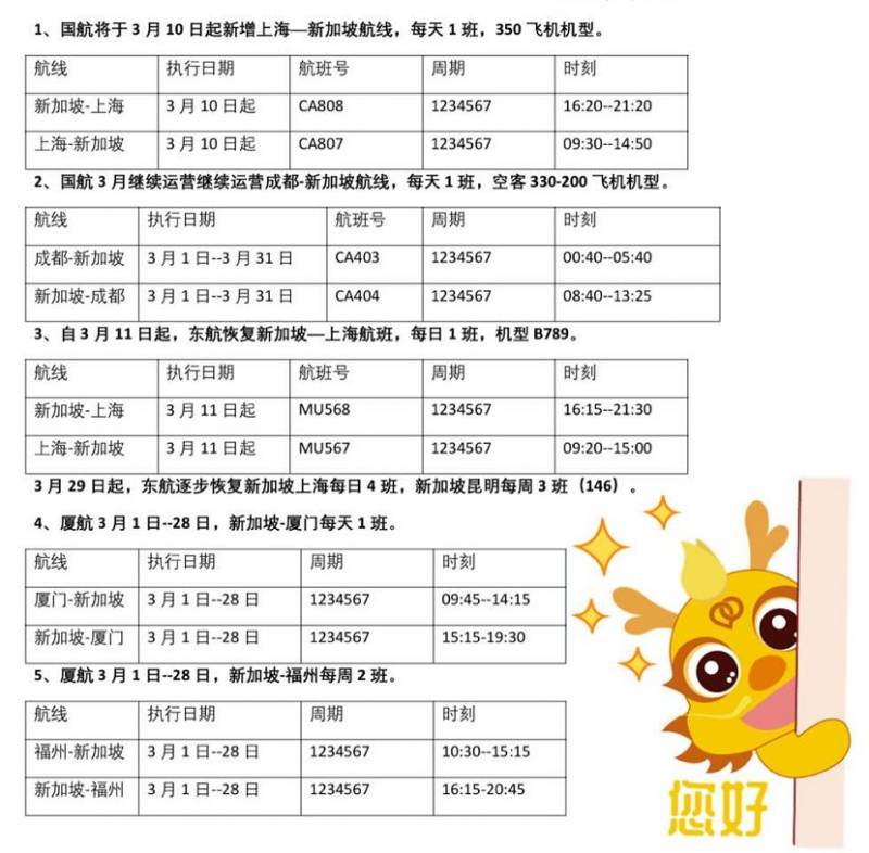 首先就是機票信息,目前還有部分航班往返于中國和新加坡之間,包括國航在上海、成都都有航班飛往新加坡;東航也已經恢複上海飛往新加坡的飛機,每周一班;廈航飛往福州和廈門的航班目前也有少量班次仍在繼續飛行。大家需要注意的是航班信息隨時都可能因爲疫情而做調整,所以要密切留意。