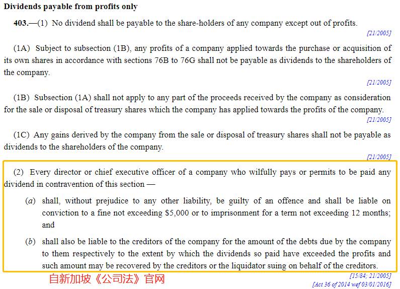 根據新加坡《公司法》第403(2)條,每位故意支付或允許支付的董事均構成犯罪,一經定罪,可處以最高5,000新幣的罰款或12個月的監禁。