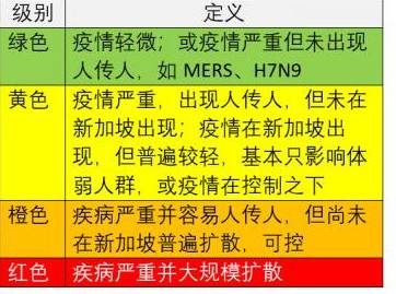 新加坡完善的DOSRSCON系統說完了對紅色預警下種種情況的推測,就不能不介紹一下新加坡的“疾病暴發應對系統條件”(DORSCON)。這個是一個以不同顔色劃分疾病爆發的不同等級,用于提醒人們如何對待不同的疾病風險。綠色,黃色,橙色和紅色四種色彩代表不同的疾病爆發狀態。不同狀態,對社區的影響也大不相同,在日常生活中應采取的措施(例如,溫度篩查,邊境措施)以及對公衆的建議(例如,尋找旅行咨詢)也大相徑庭。