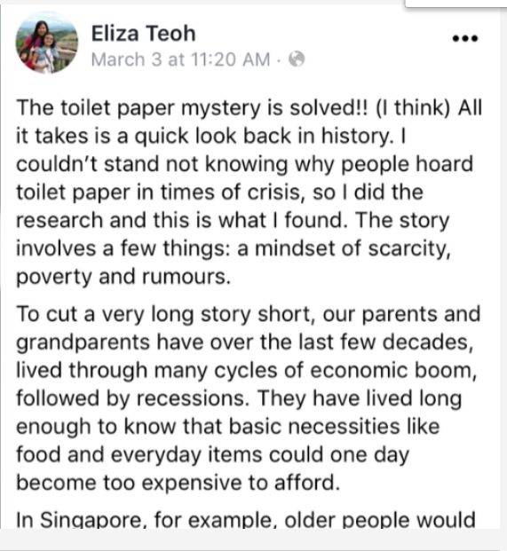 搶廁紙有曆史原因 兒童讀物作家,前新聞記者Eliza Teoh在3月3日的Facebook帖子中,展示了她的研究成果。