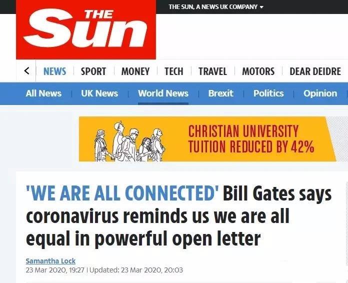 2020-3-23,英國《太陽報》全文刊登了比爾·蓋茨致公衆的一封公開信,信中的主要意思就是針對本次的新冠肺炎疫情,比爾·蓋茨希望社會大衆在恐慌之余,也能進行一些深度反思,話語中透露著這位世界首富無比的睿智和直擊靈魂的思考。