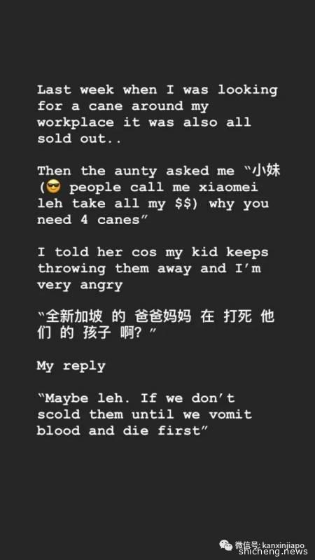 (以上圖源:Mothership)有店主還對她說:“全新加坡的爸爸媽媽在打死他們的孩子啊?”但她後來澄清,自己買藤條不是爲了“虐待”孩子,而是用來嚇唬和“威脅”他們,讓他們乖乖聽話。
