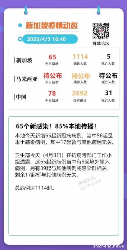 號外號外:今天(4月3日)新感染數據出了。65個確診病例,85%本地傳播,累積確診1114例。新增死亡一例。