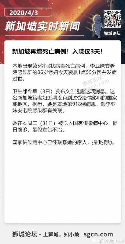 新加坡出現第四起死亡病例,確診已破千,最年長患者102歲!世衛預警全球確診將達百萬